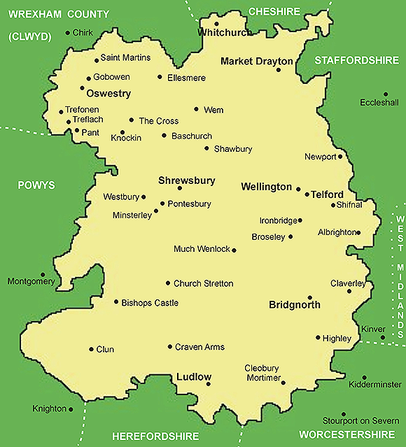 Clickable map of Shropshire Oswestry Ellesmere Wem Market Drayton Whitchurch Newport Wellington Shrewsbury Much Wenlock Broseley Telford Shifnal Albrighton Church Stretton Bridgnorth Highley Cleobury Mortimer Ludlow Craven Arms Clun Bishops Castle Saint Martins Gobowen The Cross/West Felton Baschurch Knockin Pant Shawbury Pontesbury Minsterley Westbury Trefonen/Highfield Treflach Claverley Ironbridge Kinver Kidderminster Stourport on Severn Go to Worcestershire map Go to Herefordshire map Go to Cheshire map Chirk Go to Clwyd map - Wrexham County Montgomery Knighton Go to Powys map Go to West Midlands map Go to Staffordshire map Eccleshall